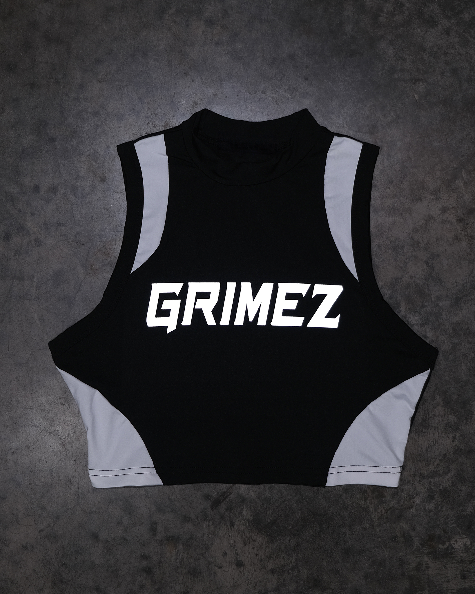 Built for movement. Designed for the spotlight. The Reflective Racer Tank is a high-performance cropped top engineered for gym sessions, nightlife, and everything in between. Featuring a bold reflective GRIMEZ logo that lights up under flash, this piece hits with futuristic streetwear energy while giving you full mobility and a sculpted, athletic fit.