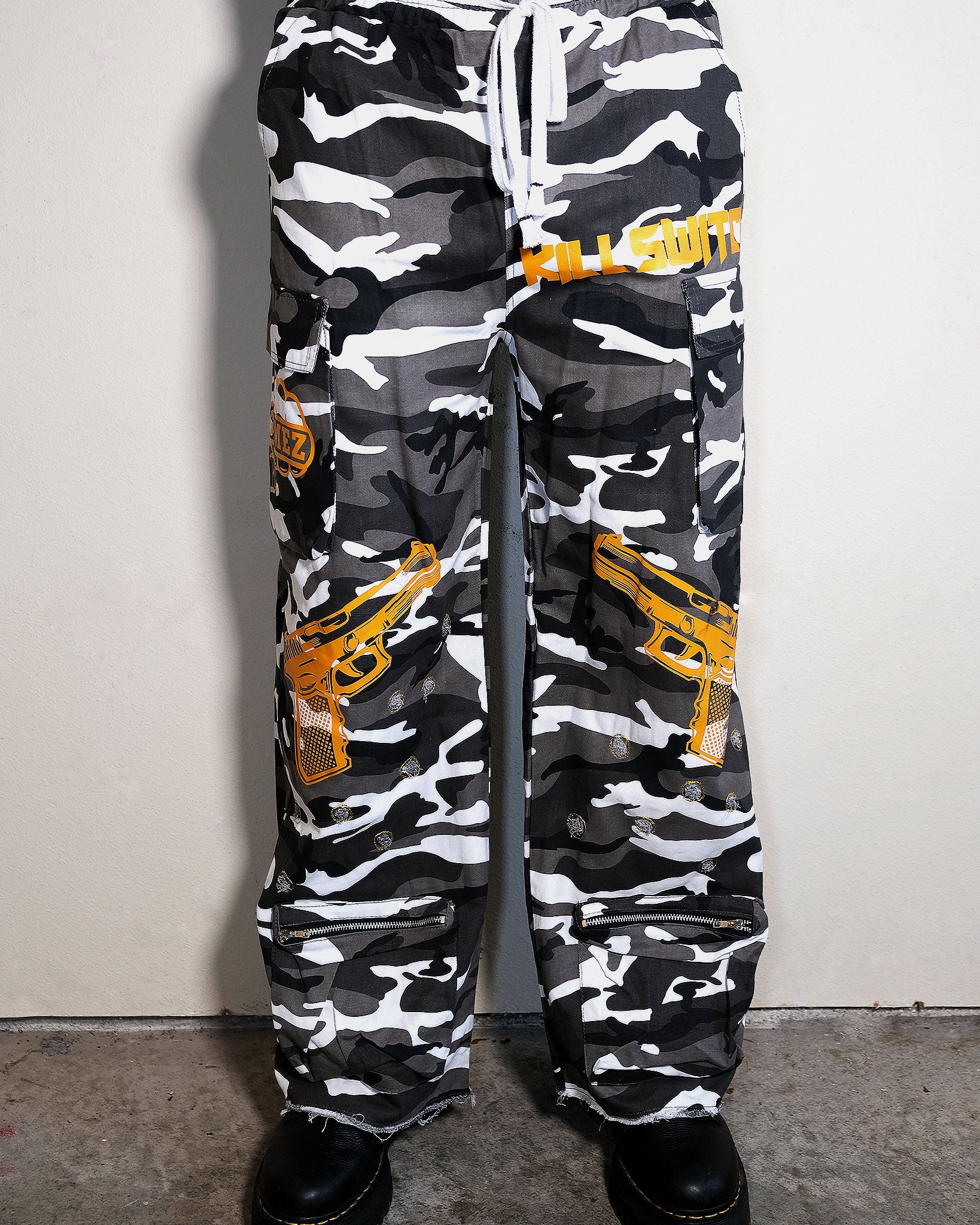 Built for the ones who don’t flinch. The KILLSWITCH Camo Cargos are a full-blown statement piece. The aggressive graphic placement, oversized golden pistol prints, and custom distressing that looks straight out of an underground film scene. Every detail snaps: bold GRIMEZ decal patches, bullet-hole accents, raw hems, and functional ankle pockets.