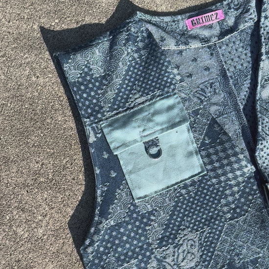 The One-of-One Patchwork Denim Vest is a fully custom, hand-constructed GRIMEZ piece made from mixed denim textures, patchwork panels, and raw-edge distressing. Every stitch, fade, and seam tells its own story. Nothing about this vest is factory-made or predictable.